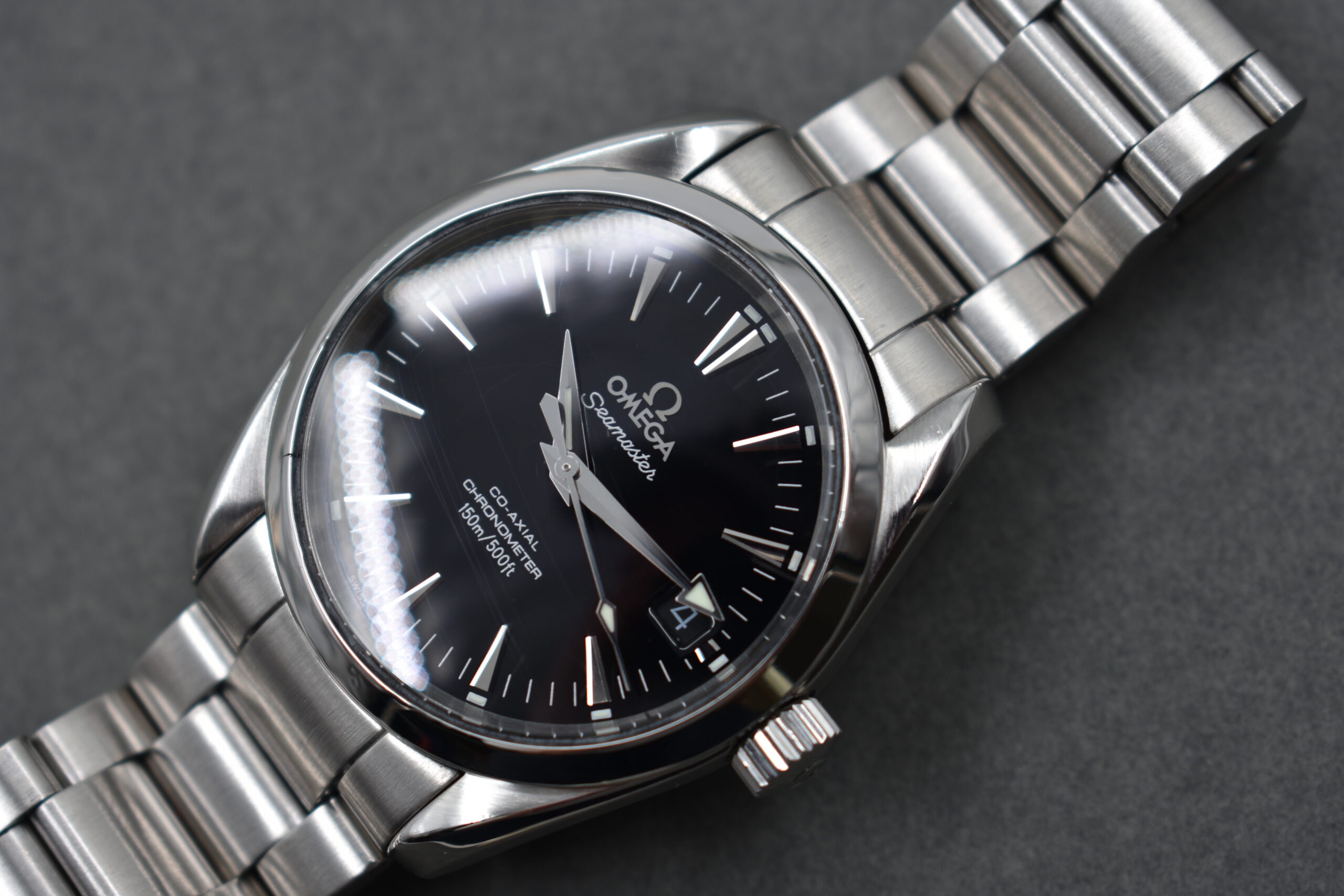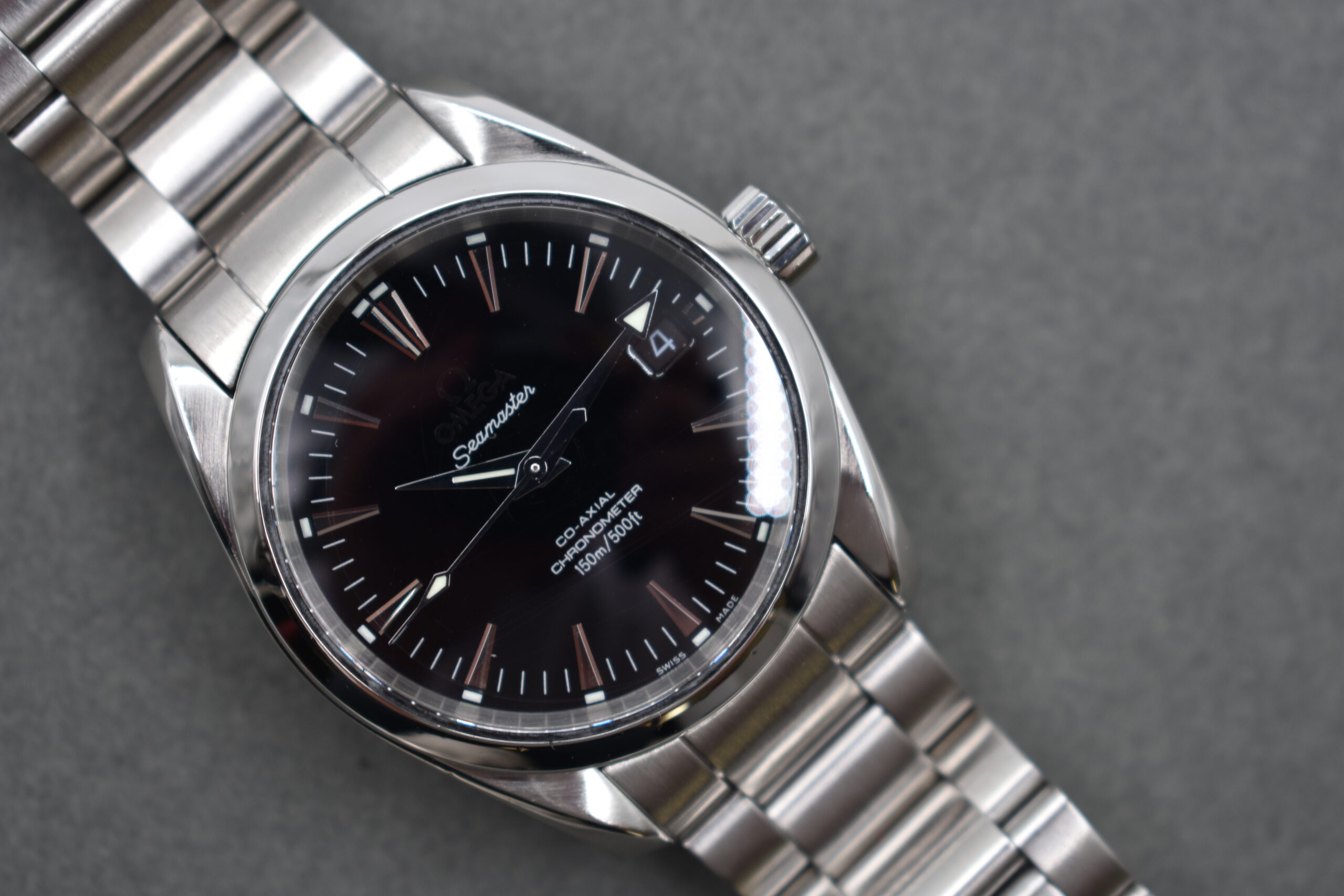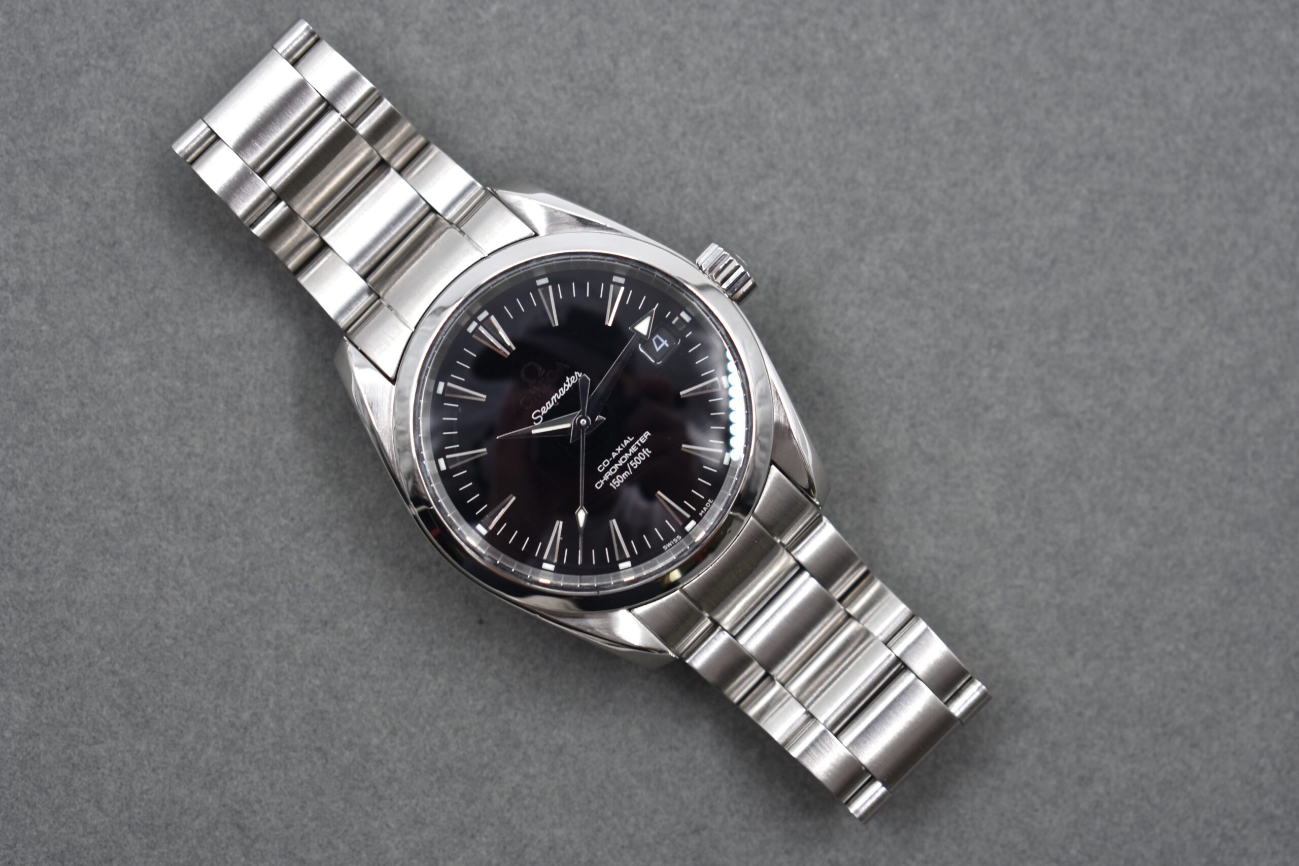 Its 36mm stainless steel case, striking black dial with teak-pattern finish, and bold arrow hands make it instantly recognizable. Powered by Omega’s Co-Axial automatic movement, it offers precision and reliability both on land and at sea.