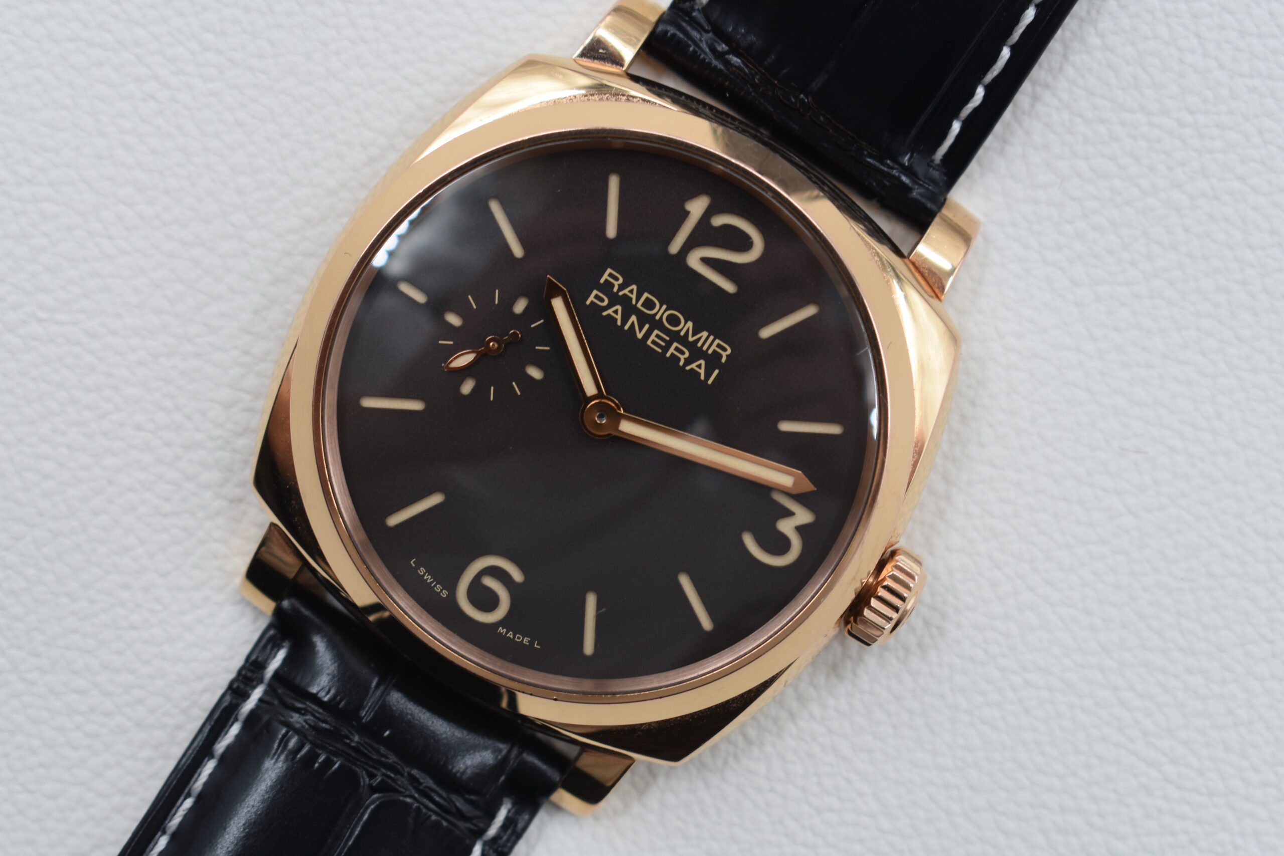 The Panerai Radiomir 1940 Oro Rosso PAM00513 is a refined take on a Panerai classic. The 42 mm 18k red-gold case gives the watch a warm, elegant presence, paired with a black dial featuring luminous numerals and a small-seconds at 9 o’clock.