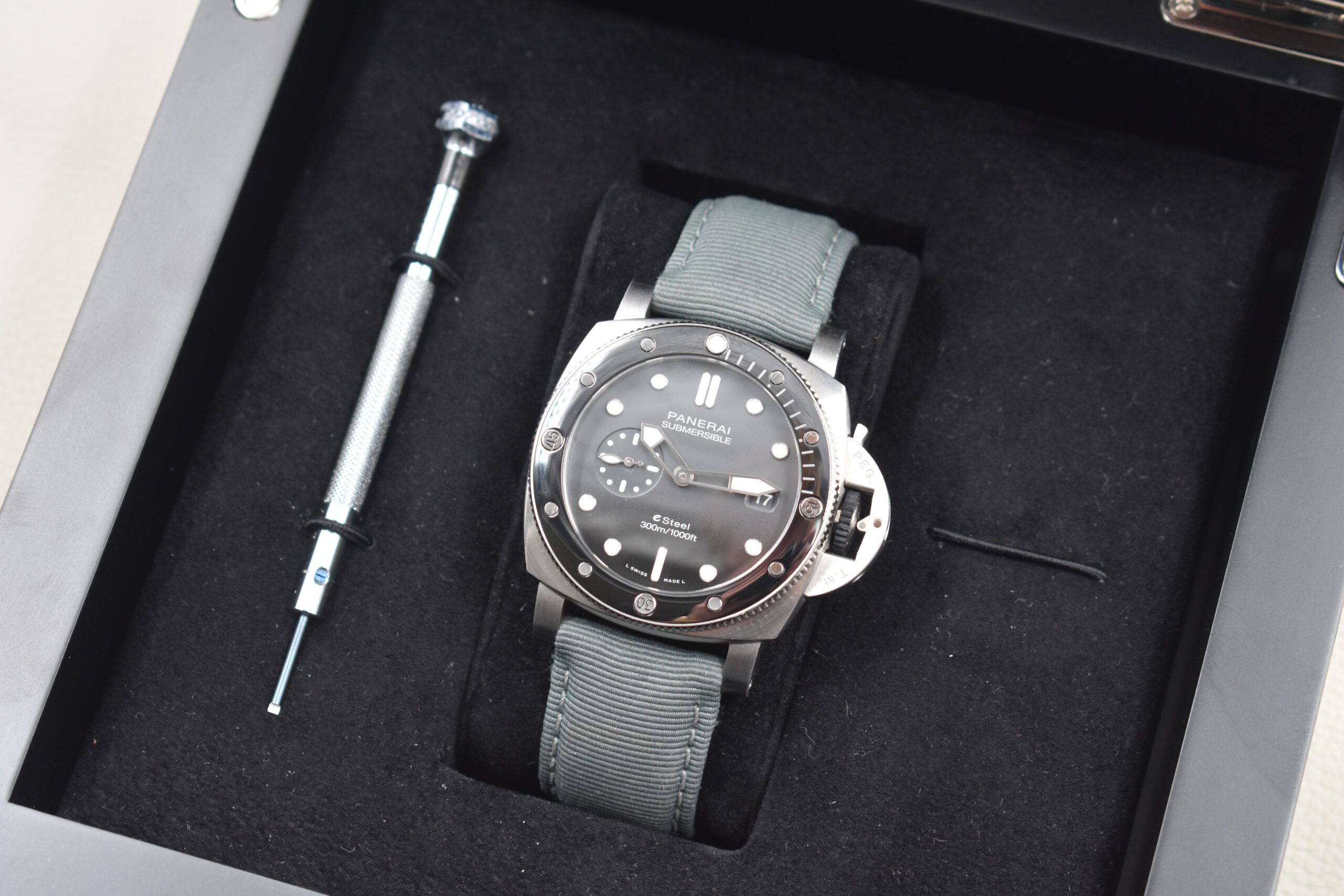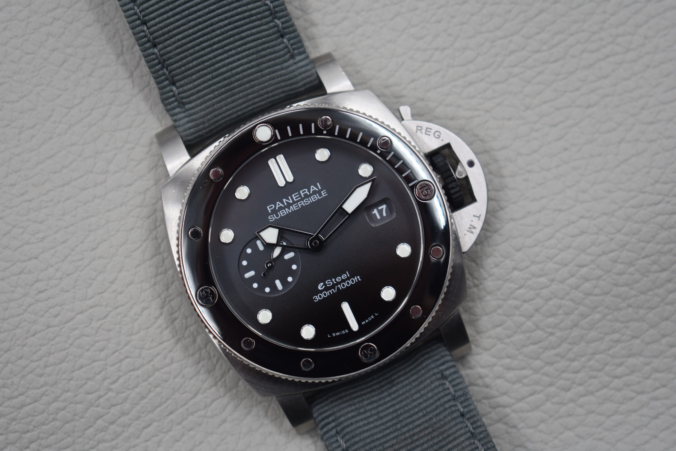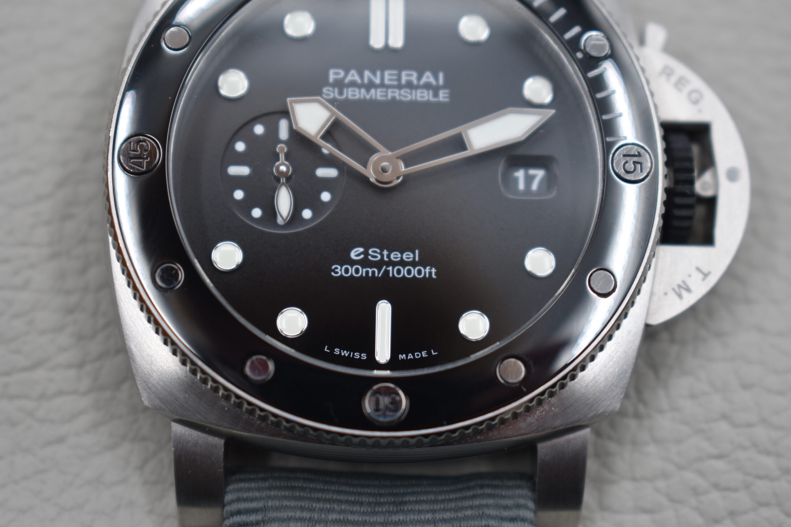 This Panerai Submersible combines rugged tool-watch heritage with modern sustainability. Crafted from eSteel™, Panerai’s recycled high-performance metal, the 44 mm case is both durable and environmentally conscious. The matte dial offers excellent legibility with luminous markers and a date window, while the unidirectional rotating bezel ensures reliable underwater timing.