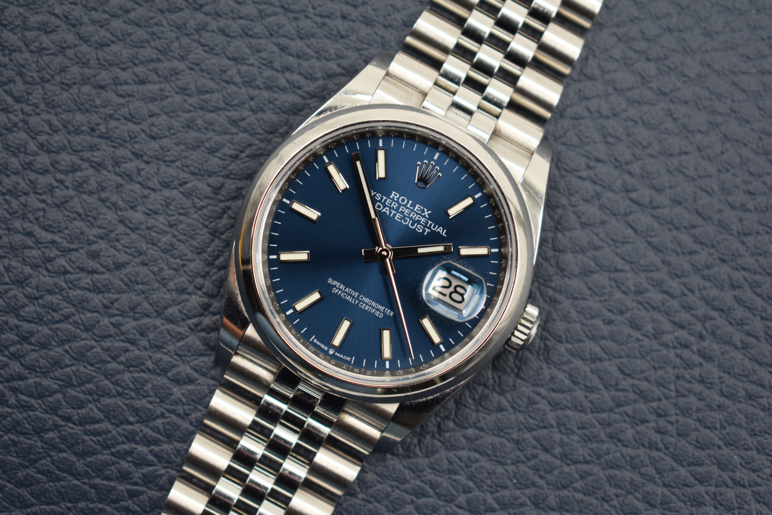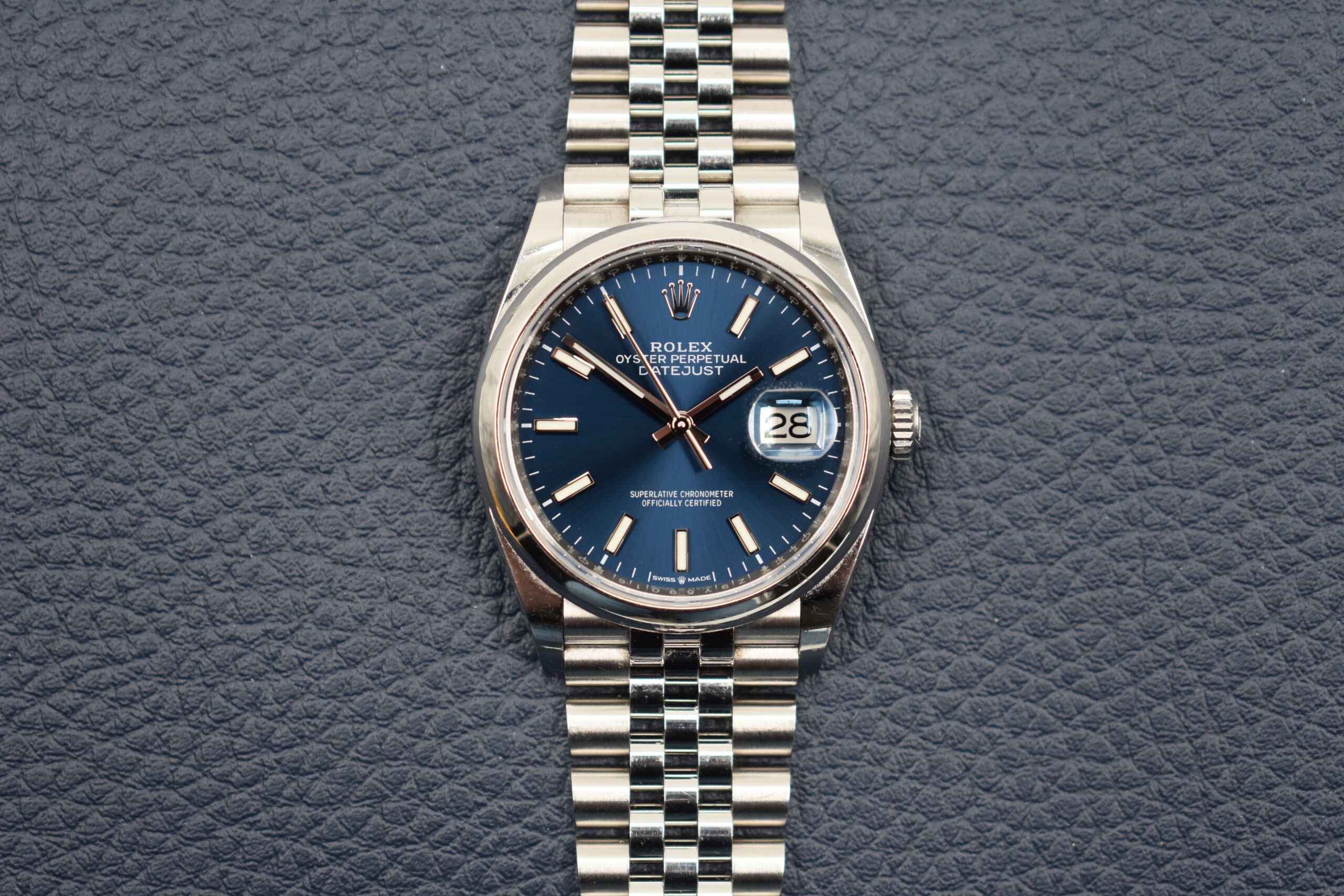 The watch features a 36 millimeter case, a smooth bezel and a jubilee bracelet. The watch remains in a very good condition and is accompanied by its original box, papers and booklets and dates back tot 2021.